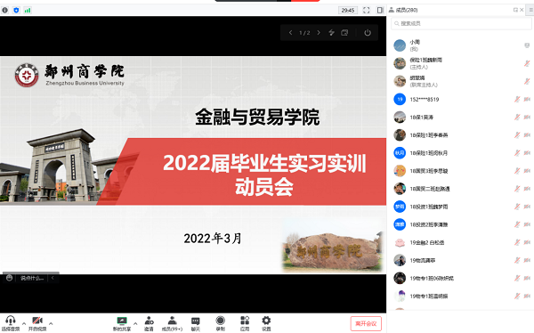 为高标准组织好我院2022届毕业生的毕业实习工作,进一步加强对毕业实习工作的全过程管理,切实提高毕业实习质量,我院于3月5日晚在线上召开2022届毕业生毕业实习宣传动员会。实习指导老师李国艳,毕业班辅导员白珀,胡慧娟及2022届毕业生参会。会议由胡慧娟老师主持。