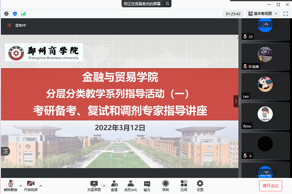 会议伊始,王主任对韩博士进行简单介绍,并表示热烈欢迎。接着,韩博士介绍了自己读研读博的经历,并对当前复试形势进行研判,引出复试和调剂话题。韩博士首先从国家线角度为学生们解读报考趋势,便于学生选择报考方向;并为学生们讲解了教育部关于研究生复试的要求,介绍了复试分值构成、复试材料准备、复试流程并罗列了中英文面试的常见问题,提醒学生们应关注2022年的经济大事;随后,韩博士又详细讲解了调剂的流程、推荐了调剂院校,并结合实例就考研心态问题对学生们做出了指导;最后,韩博士回答了参会同学的提问,并与同学们进行了亲切交流。