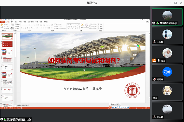 为助力我院学生考研,提高考研学子复试和调剂的成功率,我院邀请了河南财经政法大学研究生处副处长、硕士生导师韩亚峰博士于3月12日上午通过腾讯会议开展了主题为《考研备考、复试和调剂指导》的讲座。此次讲座由物流管理教研室主任王春杰主持,院长杨山峰、教学秘书胡乃峰及我院2019级考研学生、2018级考研复试和调剂学生参加。