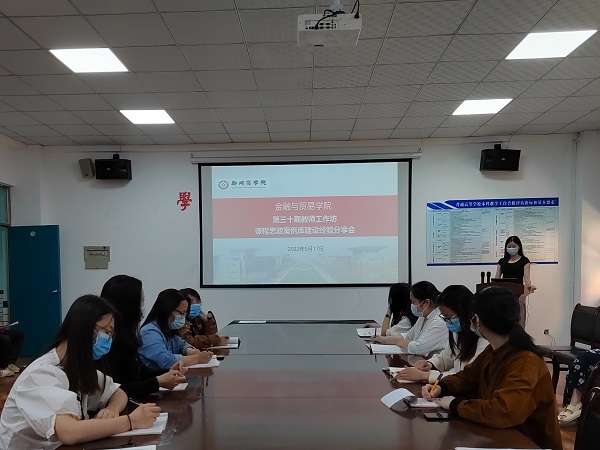 会上,首先王老师对本期教师工作坊主题活动进行简单介绍。其次,课程思政案例库各负责人曹娜、李亚敏、朱梦娣和王松枝四位老师分别就《西方经济学》、《报关与报检实务》、《证券投资学》和《保险学》等课程思政案例库建设从课程选取、成员组建、案例内容选取和思政融入等方面对各课程思政案例库建设经验进行分享。最后,各课程负责人与参会老师们对课程思政案例库建设过程中存在的问题和难点进行讨论分析,并对后期案例库建设总结和积累经验。