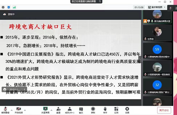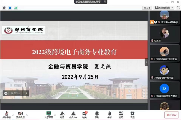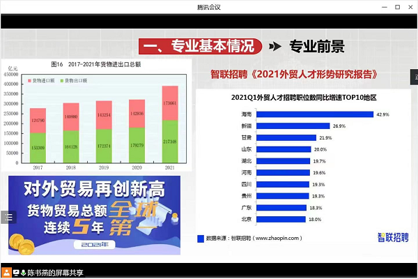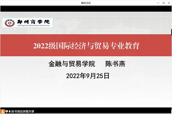 在金秋送爽,金桂飘香的美好季节,我院迎来2022级跨境电子商务、国际经济与贸易专业新生。为了帮助2022级小萌新尽快确立学习方向、树立奋斗目标,9月25日晚上,国贸教研室以腾讯会议的形式开展线上专业教育,由国贸教研室夏元燕、陈书燕两位老师作为主讲人,分别面向2022级跨境电子商务、国际经济与贸易两大专业做专业教育。