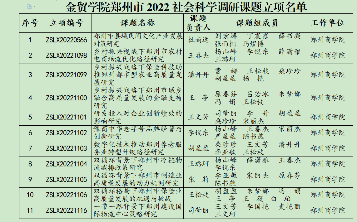 根据郑州市社会科学优秀成果评奖委员会的《关于郑州市2022年度社会科学调研课题立项的通知》(郑社评字〔2022〕4号),我院11项郑州市2022年度社会科学调研课题获批立项。