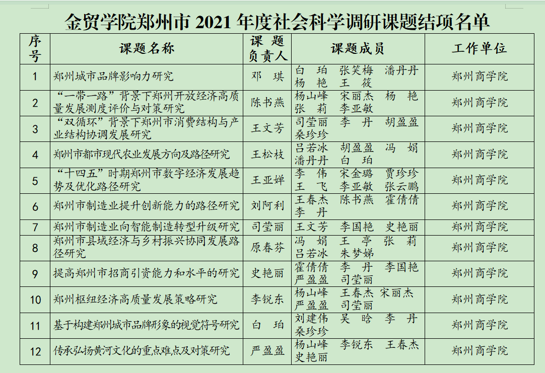 根据郑州市社会科学优秀成果评奖委员会《关于郑州市2021年度社会科学调研课题结项的通报》(郑社评字〔2022〕2号),我院12项郑州市2021年度社会科学调研课题顺利结项。望各课题组认真总结工作经验,将今后的社会科学调研课题工作做得更好。