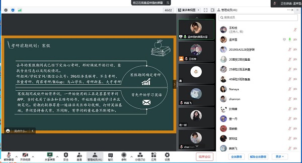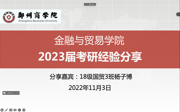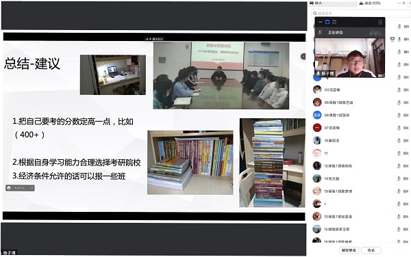 为进一步做好我院考研指导工作,全力提高学生考研上线率,11月3日晚上,我院采取线上会议的方式举办了2023届考研经验分享会。会议邀请了2018级优秀考研上岸学生杨子博、孟祥雪两位同学为2019级、2020级同学做考研经验分享,2019级、2020级考研学生参加。