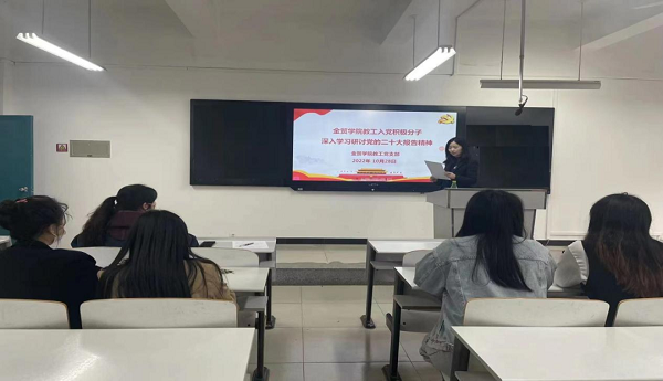 10月28日,我院教工党支部在1304教室召开教工入党积极分子深入学习贯彻党的二十大会议精神研讨会,会议由教工党支部书记曹娜同志主持。会上,大家又一次重温学习了《高举中国特色社会主义伟大旗帜 为全面建设社会主义现代化国家而团结奋斗》报告内容,并积极分享自己的感受。孙闪闪老师表示党的二十大报告内容丰富,思想深刻,鼓舞人心,催人奋进。在今后要坚定不移跟党走,站稳立场、把牢方向,沿着二十大报告为我们指引的方向奋勇前行。同时,坚守为党育人、为国育才的理念,把二十大会议精神融入文化知识教育、社会实践教育,为党的教育事业发展贡献智慧和力量。