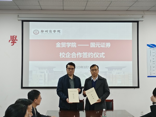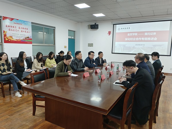 3月1日,国元证券股份有限公司河南分公司副总经理蒋国舞、营销总监徐坤杰莅临我院洽谈校企合作事宜,我院召开“金贸学院-国元证券深化校企合作专题”推进会,会议由院长杨山峰主持,党委书记吕鹏、副院长李伟、投资学教研室主任宋金璐及教研室全体无课教师参加。