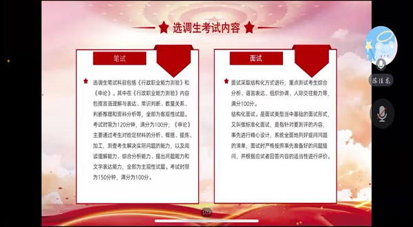 交流过程中,陈佳龙同学从什么是选调生、选调生具备条件、考试内容、自身感受四个方面分享了自己作为选调生踏入社会的经验;并通过两个视频为大家展现了他目前的工作情况。最后,陈佳龙鼓励同学们做好大学人生规划,早准备、早实践;要有毅力、有韧性、会坚持;要摆正心态、正视最终结果。