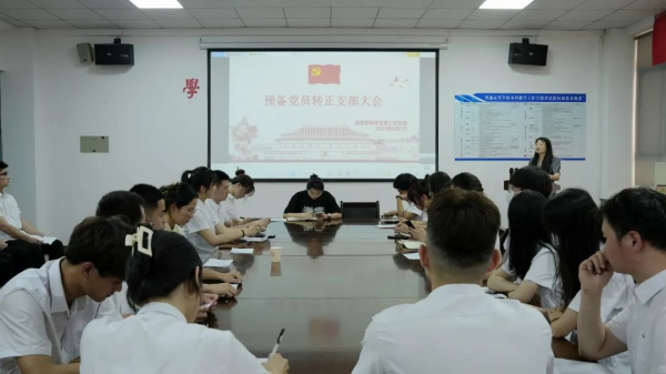 会议开始,由支部书记赵丹阳同志首先简短的介绍了预备党员转正程序,具体按以下四个流程进行:预备党员逐个汇报培养考察期间的表现情况、概述自身不足及努力方向、党员进行投票表决、支委会讨论决议、入党宣誓。