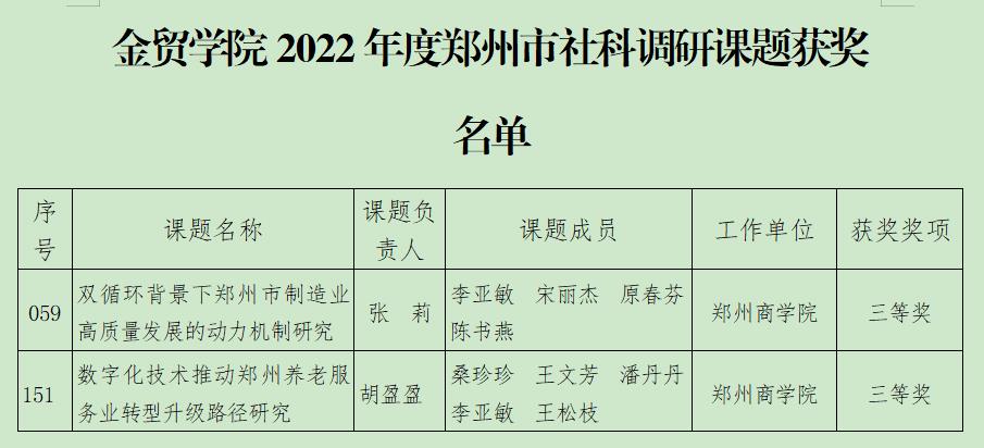 根据郑州市社会科学优秀成果评奖委员会的《关于郑州市2022年度社会科学调研课题表彰的决定》(郑社评字〔2023〕3号),我院2项郑州市2022年度社会科学调研课题荣获三等奖。望各位老师再接再厉,积极投身于科研工作中,取得更多科研突破。获奖名单见截图。