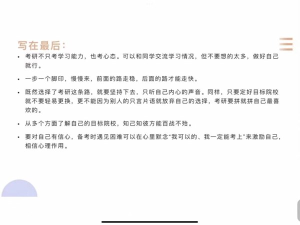本次分享会使同学们对考研有了更深刻的了解,并且收获了学姐分享的宝贵经验,同时也为有志于考研的同学在前进的道路上提供了一盏明灯。
