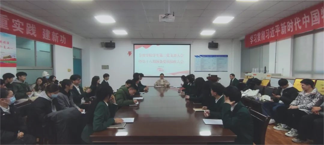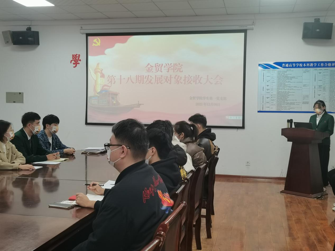 2023年12月7日,金贸学院学生第二党支部召开第十八期预备党员接收大会,讨论接收发展对象黄滢竹、刘紫彤等8名同志入党问题。金贸学院第二党支部书记曹君秀主持会议,支部全体党员参加。