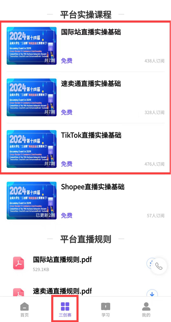 同时,为了引导学生了解行业前沿,本次实习开展线上专题学习,主要针对国际站、速卖通和TikTok平台直播实操三个专题,主要内容为“三创赛”资格赛前置知识,在“弧米跨境”小程序进行,由学生自主学习,指导教师加以指导。