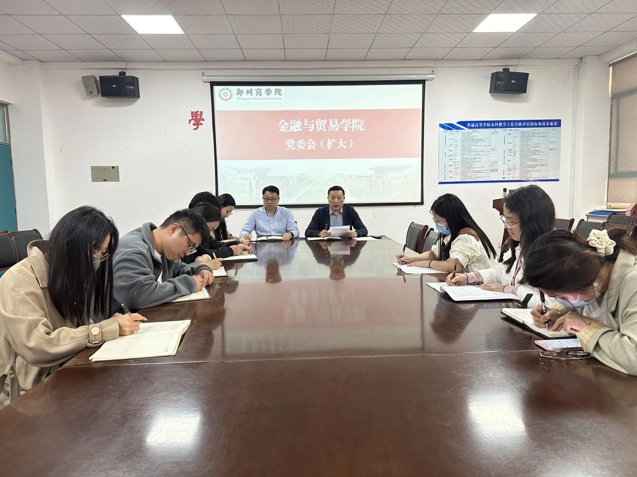 4月14日下午,金贸学院召开党委扩大会议,传达学习贯彻习近平总书记关于党纪学习教育的重要讲话和重要指示精神,认真贯彻落实中央党的建设工作领导小组会议精神和省委常委会会议精神,研究部署学校党纪学习教育工作。金融与贸易学院党委书记吕鹏、党委副书记梁鹏、党委委员及我院全体党支部书记参加会议。
