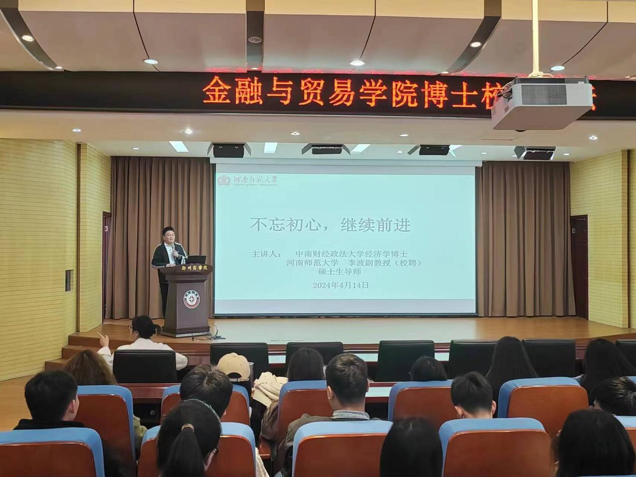 两秩芳华,岁次甲辰。为进一步帮助在校学生了解就业形势、明细未来发展方向,增进校友与母校情谊。我院于4月14日,由招生就业处主办、金贸学院承办的校友讲坛第二十期——“听校友学术奋斗路 励人生发展新起点”在图书馆五楼报告厅举行。在建校二十周年之际,我院特邀2009级毕业生,现中南财经政法大学经济学博士,河南师范大学硕士生导师李波副教授开展本次校友讲坛活动。