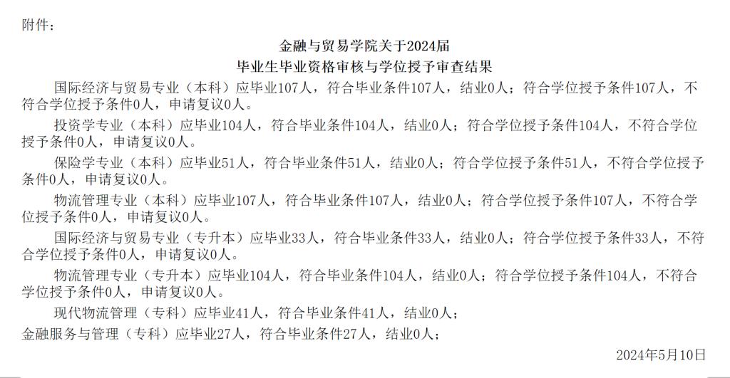 现将2024届毕业生毕业资格及学位授予资格审查结果予以公示,公示期:2024年5月11日-5月13日,公示期间若有异议,请反馈至金融与贸易学院办公室。