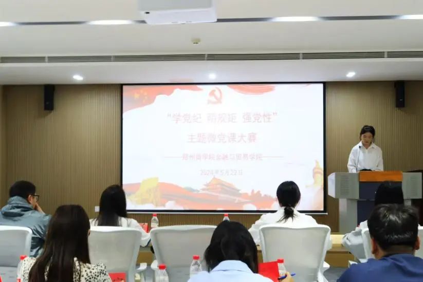 为深入学习贯彻党的二十大精神,推动习近平新时代中国特色社会主义思想深入人心,在全院上下营造学纪、知纪、明纪、守纪的浓厚氛围,5月22日下午,由金贸学院党委举办的“学党纪明规矩 强党性”主题微党课大赛在32号楼“一站式”学生社区团体活动室顺利举行,金贸学院辅导员老师以及学生代表观看了此次比赛。