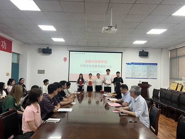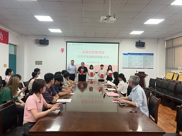 会上,陈书燕老师首先宣读了《关于表彰金贸学院“优秀学生监控信息员”的决定》,并由吕鹏书记、贾孝魁副院长为丁志栋等8位优秀学生监控信息员颁奖。其次,优秀学生监控信息员代表丁志栋同学从对学生信息员工作的认识和如何履行工作职责两个方面分享自己的工作体会和工作经验。最后,吕鹏书记进行总结讲话。吕鹏书记充分肯定了学生信息员在学院教风学风协同建设中扮演的重要角色,并勉励全院学生信息员向受表彰的同学学习,认真履行工作职责,持续发挥其作为学院和学生沟通纽带的作用,建立良好的信息互通机制,促进学院教风、学风的全面提升。