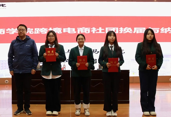 在颁奖仪式结束后,院长梁鹏向新一届跨境电商社团的负责人颁发了聘书,并鼓励社团通过行业企业业务培训、专题讲座以及引进项目进校园等一系列活动,为学生打造一个交流和分享外贸专业知识、提升专业技能的平台。