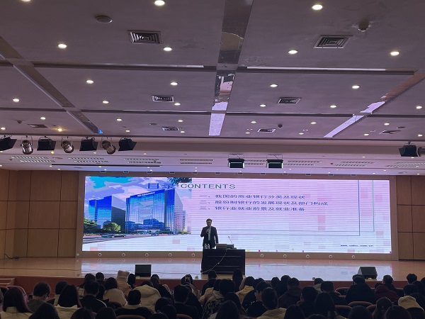 张旭瑞经理分别从我国商业银行的分类、股份制银行的发展现状以及银行业就业前景等方面向同学们全方位讲解了关于商业银行的体系构架,并于讲座最后部分聚焦于银行业的就业前景,强调了银行业对复合型人才的需求,鼓励同学们不断提升数据分析能力、沟通协调能力等软实力。