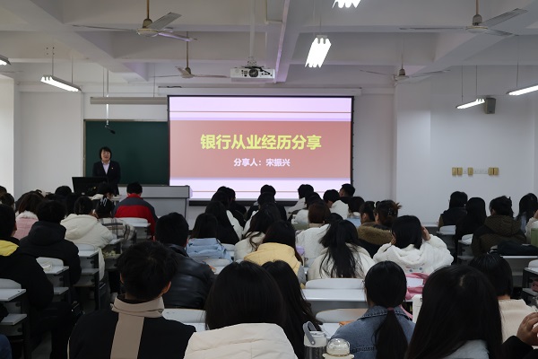 活动中,徐老师对中国银行巩义支行副行长张嘉儒和中国银行高新技术开发区支行消费金融部经理宋振兴的到来表示热烈欢迎。随后,宋经理围绕入行从业经历、银行基础工作分类、银行个人贷款、银行业职业规划、个人征信报告解读、消费者风险提示六个方面进行全方面讲解,利用专业化的知识背景、职业化的授课视角、丰富的职场阅历,为学生们带来了更精彩、更实用的授课内容。最后,宋经理精心安排了活跃气氛的有奖问答,学生们围绕银行从业准备、未来职业规划等方面积极提问,张行长和宋经理一一作答,课堂氛围热情高涨。