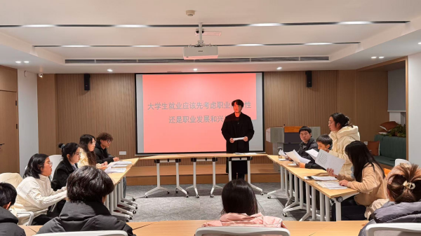为践行“就业育人”理念,打造“就业思政”大课,增强职业发展教育实效,引导、鼓励大学生树立正确的人生观、价值观、就业观,帮助大学生有效提升自身的就业技能与实践能力,我院举办“思辨青春,职引未来”创新创业辩论赛。本次辩论赛围绕“大学生就业应先考虑职业稳定性还是职业发展与兴趣”展开,吸引众多学生观摩。