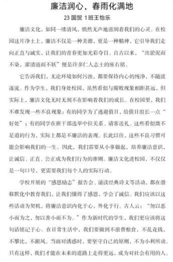 作品简介:本文深入探讨了廉洁文化在校园中的重要性和影响力。文章通过比喻和历史引述,强调了廉洁作为一种美德和精神,对个人成长和社会发展的积极作用。作者指出,尽管校园看似远离腐败,但廉洁文化依然在潜移默化中影响着学生,尤其是在面对日常的不良行为时,如逃避值日、选举中的不正当行为等。最后,作者引用古人的智慧,提醒学生在日常生活中坚守原则,不为小利所动,以期在未来成为对社会有贡献的人。