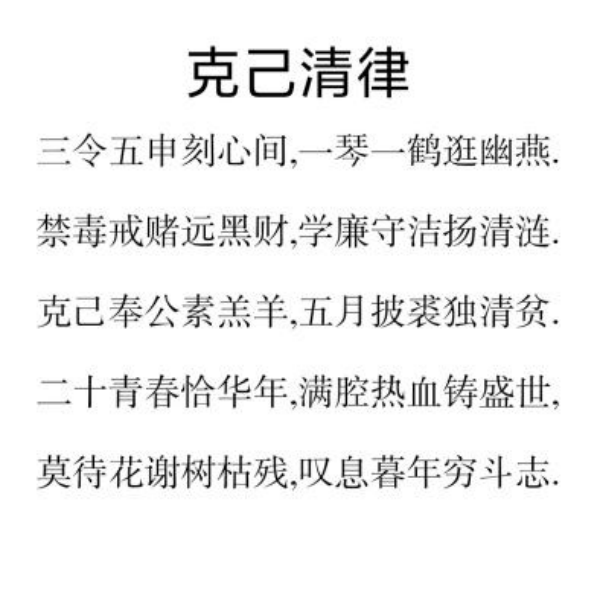 作品简介:诗的首句“三令五申刻心间,一琴一鹤逛幽燕”,表达了对规章制度的铭记和清心寡欲的生活态度。“禁毒戒赌远黑财,学廉守洁扬清涟”,强调了远离不良行为和追求廉洁清正的理念。“克己奉公素羔羊,五月披裘独清贫”,体现了自我克制、奉公守法的高尚品德,以及甘于清贫的生活作风。“二十青春恰华年,满腔热血铸盛世,莫待花谢树枯残,叹息暮年穷斗志”,则表达了在青春年华时应充满热血,为国家和社会做出贡献,不要等到年老时才后悔失去了奋斗的意志。