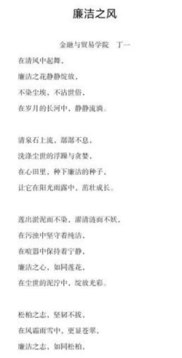 作品简介:本诗通过一系列形象生动的比喻,来赞美廉洁的品质。诗的开篇描绘了廉洁之花在清风中静静绽放,不沾染世俗尘埃,在岁月长河中静静流淌,体现出廉洁的纯净与持久。接着,诗中提到清泉石上流,用清泉洗涤尘世的浮躁与贪婪,寓意廉洁能净化心灵。诗中还将廉洁比作心田里种下的种子,在阳光雨露下茁壮成长,象征着廉洁品质需要培养和呵护。此外,诗中用莲出淤泥而不染和松柏在风霜雨雪中更显苍翠来比喻廉洁者在污浊环境中坚守纯洁,在艰难困苦中坚韧不拔,充分展现了廉洁之风的高尚与可贵。整首诗通过优美的语言和贴切的比喻,传达出对廉洁品质的歌颂与赞美。