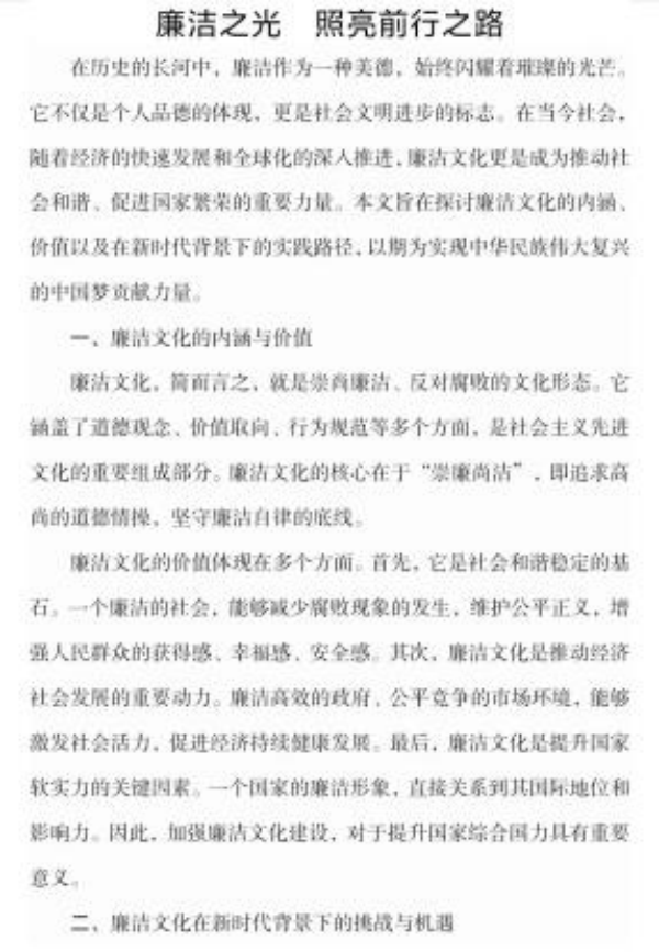 作品简介:文章开篇阐述了廉洁在历史长河中作为一种美德的重要性,它不仅是个人品德的体现,更是社会文明进步的标志。在当今经济快速发展和全球化深入推进的社会背景下,廉洁文化对于推动社会和谐、促进国家繁荣具有重要力量。