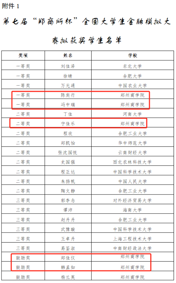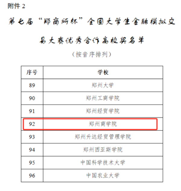 近日,由郑州商品交易所和中国期货业协会联合主办的2024年第七届“郑商所杯”全国大学生金融模拟交易大赛圆满成功,该比赛属于2024年河南省高等学校大学生学科竞赛省级竞赛项目,是我省高等商科教育领域中专业覆盖全面、校企合作深入的赛事活动,含金量极高。本次大赛吸引了全国2062所高校参加比赛,参赛的报名人数高达92041人。在我院投资学教研室主任朱梦娣及专职教师原春芬、赵冰洁、宋金璐老师的指导下,21级投资学专业陈奕行和冯中瑞同学荣获一等奖,宁佳乐同学获得二等奖,22级投资学专业郑佳仪和韩孟如同学获得鼓励奖。同时beat365荣获优秀合作高校奖。