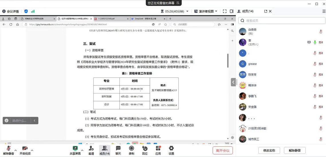 为助力考研学子突破复试关卡,圆梦理想院校,我院投资学教研室于2025年2月26日,通过线上腾讯会议的形式召开了考研复试经验分享会。会议邀请现就读于河南农业大学农村发展专业的2020级投资学专业优秀毕业生张家奎为大家开展分享,2025届投资学专业考研过线学生及指导老师参加。