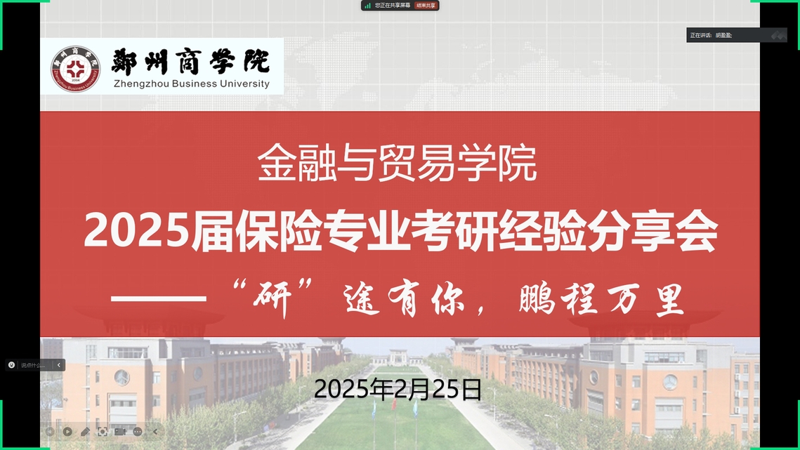 为帮助2025届考研学子科学规划复试策略、掌握应试技巧、提升核心竞争力,我院分别于2月25日晚上、2月26日上午通过腾讯会议平台举办两场硕士研究生复试经验分享交流会。会议特邀2023届牛珂馨、2024届刘鹏倩两位优秀毕业生作专题分享,考研教研室主任王亚婵、保险经济教研室主任杨艳及2025届预通过山西财经大学、辽宁大学初试学生共同参与,由考研教研室胡盈盈老师主持。