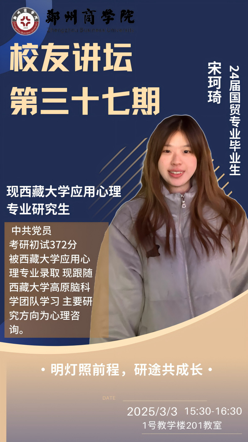 为激发学生考研热情,帮助备考学子更加清晰地规划考研之路,拓宽专业视野,助力我院考研学子成功进入自己的理想院校。3月3日,由招生就业处主办、金贸学院承办的校友讲坛第三十七期——“明灯照前程,研途共成长”于一号楼201教室开讲。本次讲坛特邀beat36524届国际经济与贸易专业优秀毕业生宋珂琦学姐为大家分享考研经验。