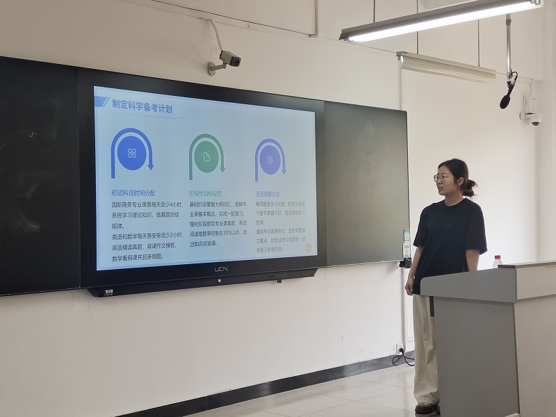 会上,李国艳老师首先回顾了2025届跨境专业的考研佳绩:樊承鑫、邢林燕、马骏等11名同学成功考取国内外高校,涵盖本专业及跨学科方向。李老师强调,这些优秀学长学姐的成长路径充分证明了“努力与策略并重”的重要性,并鼓励在场学生以他们为榜样,科学规划、坚定目标。