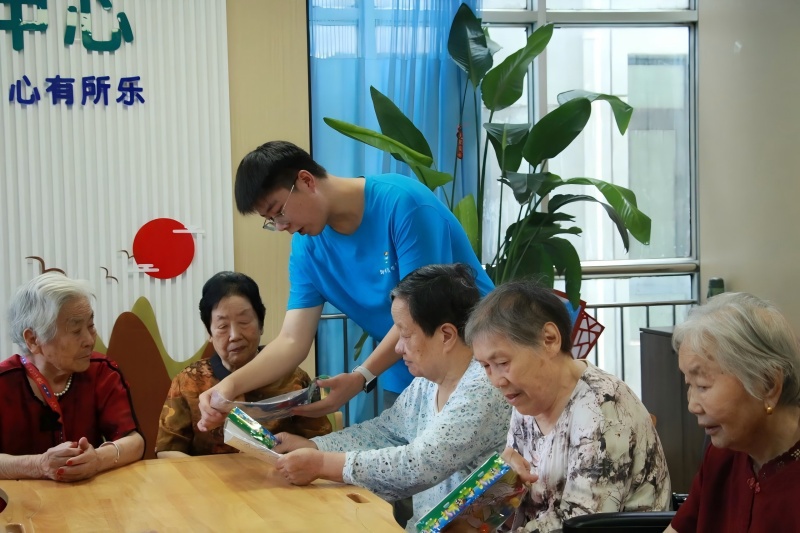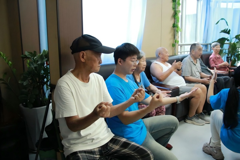 健康关怀板块,队员们带领老人做起“健脑手指操”,通过揉按穴位、关节屈伸等简单动作,帮助老人锻炼手部精细动作,促进身体机能协调。