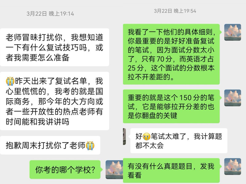 面对二战学子周末晚上发来的复试进面消息,孙老师即刻响应学生需求,积极查找目标院校往年复试要求及细则,结合学生实际给出具体复试复习方向,搜集课程资源帮助学生尽快掌握复试专业课技巧,同时积极鼓励学生,使其保持良好心态,最终助力学子复试逆袭突围,用专业与温度诠释了“考研点灯人”的使命担当。