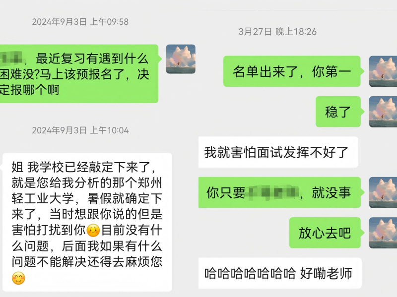 面对学生择校焦虑,孙老师积极收集全国院校近3年报录比、分数线、真题风格,建立“考研数据库”,结合学生本科成绩、性格特质,面对面帮助学生分析目标院校的优缺点,助力学生选择适合自己的院校,其中一位学生在孙老师的建议下选择郑州轻工业大学作为目标院校,最终取得笔试第一的好成绩。