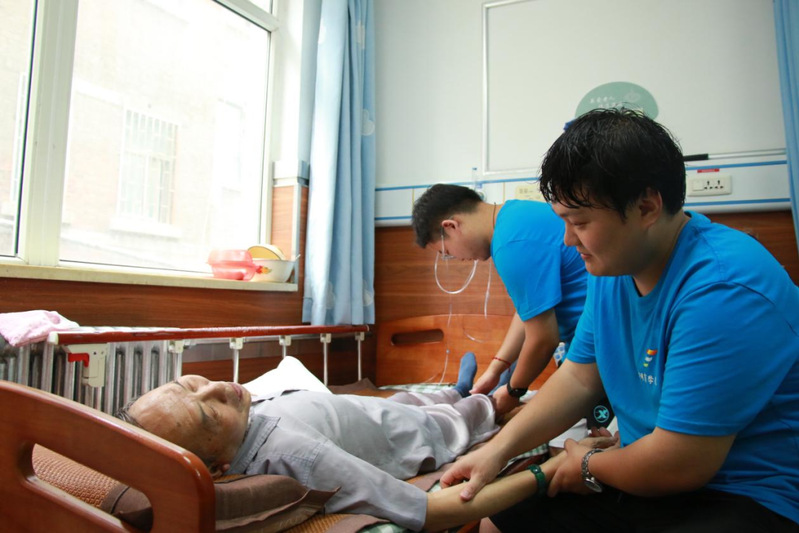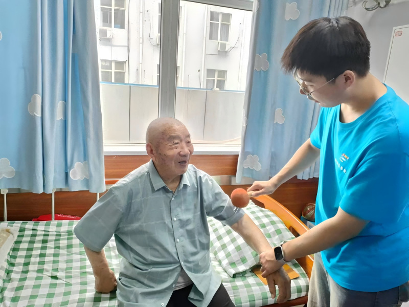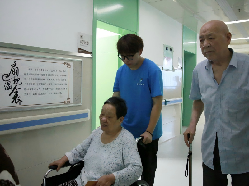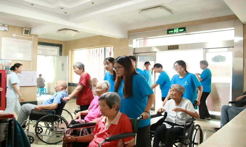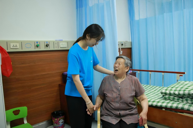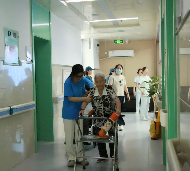 随后,成员们或搀扶着腿脚不便的老人,或轻推坐轮椅的老人,沿着医养中心的小径缓缓前行。行进间,老人们缓缓说起与家人相关的往事,成员们或是轻握老人的手,或是俯身贴近倾听,用自然的肢体语言传递温暖。散步后,又护送老人回房,协助躺卧、整理被褥,让老人安稳休息。
