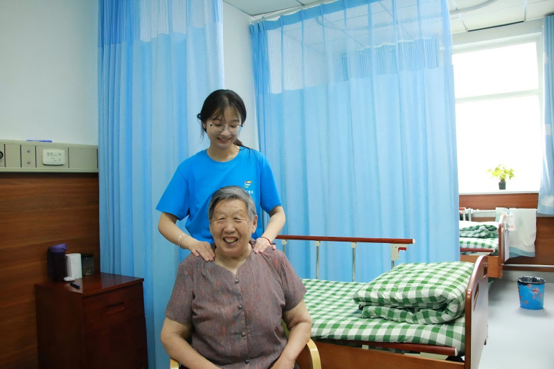 最后,在护理人员指导下,成员们学习基础按摩手法,为老人进行肩颈、手部、腿部按摩,缓解肌肉紧张、改善局部血液循环。成员们在按摩的同时与老人聊天,当聊到开心处,有的老人会情不自禁哼起老歌,让房间充满笑声。