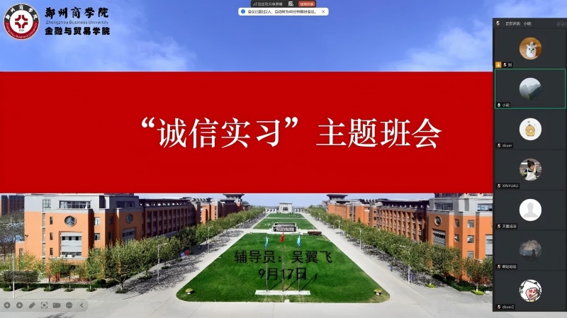 为强化毕业生职业道德教育,引导树立诚信实习理念,规范实习实践行为,9月15日,金融贸易学院面向2026届全体毕业生组织召开了“诚信实习”线上主题班会。