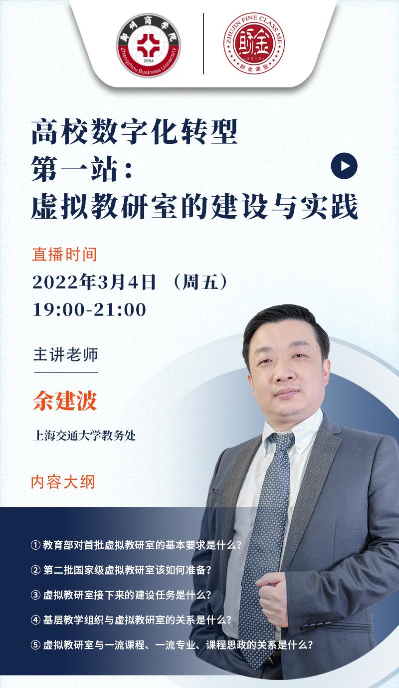 为加快推进虚拟教研室建设,助力虚拟教研室试点申报,beat365组织全体基层教学组织负责人及教研室主任参加了由助金课堂于3月4日晚举办的“虚拟教研室的建设与实践”专题培训。