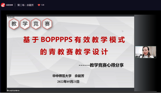 本次培训邀请佘能芳、刘源、韩宇、徐琰、沈凯凯五名往届青教赛获奖教师从获奖选手视角进行分享。分享主题分别是“基于BOPPPPS有效教学模式的青教赛教学设计”、“摆脱贫困——新时代的中国实践”、“如何备战全国高校青年教师教学竞赛”、“新工科视角下全国青教赛与教学经验分享”、“以赛促教,站好三尺讲台”。