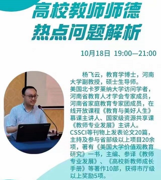 本次培训邀请河南大学杨飞云副教授主讲。杨教授从教师职业道德就在身边、教师职业道德热点问题、教师师德素养的提升三方面入手,结合师德失范典型案例,深度解析了新时代高校教师师德热点问题。