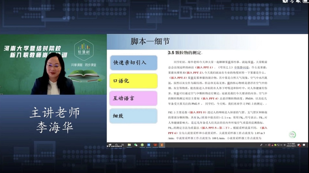 本次专场培训邀请河南大学陈卫华副教授和华北水利水电大学李海华教授主讲。陈教授以“课程思政建设:知与行”为主题,阐述了课程思政建设的任务、目标、路径和期待,并以知、行两个方面为切入点,详细介绍了课程思政是什么,做什么,如何做。李教授以“案例式教学在《环境监测》线上线下混合式教学中的应用实践”为主题,介绍了案例式教学的原则和方法,并展示了案例式教学在《环境监测》线上线下混合式教学中的一些成果。