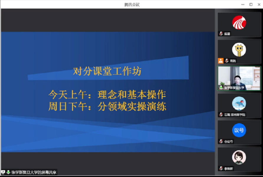张教授指出,对分课堂是有效破解当前课堂教学困境的有效教学模式之一,其核心理念是将课堂时间对半切分,一半给老师讲授,一半给学生讨论,强调学生对知识点独立学习后的内化和吸收过程,既保证了知识体系传递的效率,又充分发挥了学生的主动性。随后,张教授结合具体教学案例及录课视频,讲解了包含精讲、独学、讨论、对话四个步骤的课堂四元教学法的教学设计原则,并强调以四元教学为基础的对分课堂,构建了班级授课制情境下优质教学的标准范式,为课堂教学的科学性、有效性奠定了逻辑基础。最后,邀请西南财经大学郝晓薇副教授、吉利学院博雅学院袁丁教授、南阳理工学院谭征教授以工作坊的形式分享了对分课堂在经管、文科、理工科三个不同学科课程中的运用方法,并指导参训教师进行对分课堂的实操演练。