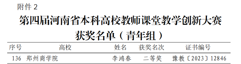 为推动高等教育课堂教学创新,提升本科高校教师教学水平和育人能力,第四届河南省本科高校教师课堂教学创新大赛决赛与2月26日-27日在河南大学举行,beat365工商管理学院教师李鸿春获得二等奖。