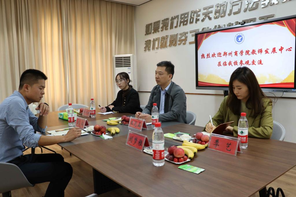本次活动以访学形式开展,对接商丘工学院教师发展中心主任冯晓艳、副主任王博及中心教师。两位主任及教师为我们展示了中心的“智慧教室”“微格教室”“虚拟演播室”等硬件设施,随后,在研讨室内双方围绕教师发展中心场地建设、如何科学制定教师培养培训工作、服务体系构建及提高教师工作成效等重点问题进行深入探讨。