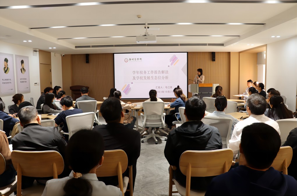 为进一步贯彻落实校务工作部署安排,助力教师深入把握学校发展“生态位”情况,10月31日上午,教师发展中心特邀请发展规划处处长马江雁在32号楼学生一站式活动中心研讨室就本学年校务工作报告进行解读,并对当前学校发展“生态位”情况进行分析。会议由中心副主任季艺主持,各学院60余名无课教师参会学习。