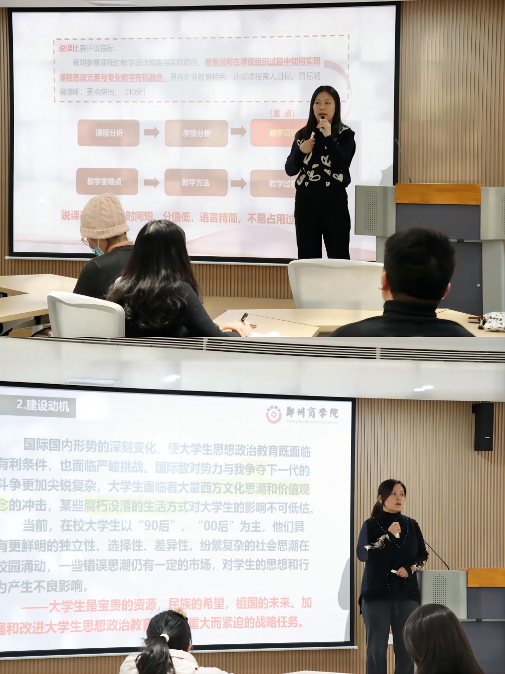 会上,张樱老师先以课程思政教学设计大赛为例,结合自身经验作分享,从优化顶层设计、说课比赛制度方案和评议指标探索、课程思政的设计思路、加强赛后交流培训等不同方面,与参会教师探讨交流,提出比赛建议、给出满满干货。接着,白静老师以“课程思政建设的认识与实践——教师站好讲台的根本”为主题,结合自身课程的改革实践,紧紧围绕课程思政建设的重要性、挖掘思政元素的途径、课程思政教学设计三方面,重点分享了如何保证教学效果、如何将家国情怀恰当地融入教学,将课程思政内涵深入浅出。两位老师的经验分享贴合实际、润物无声,参会教师听后深受共鸣与启发。