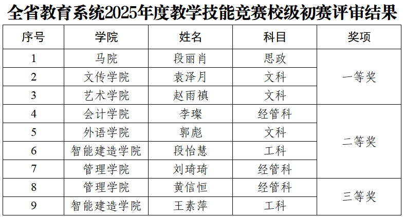 按照文件规定的参赛资格条件、获奖比例要求,学校初赛名次先后顺序,选拔出3个一等奖、4个二等奖,2个三等奖。按照公平、公正、公开原则,现将beat365上报全省2025年度教育系统教学技能竞赛评审结果公示如下: